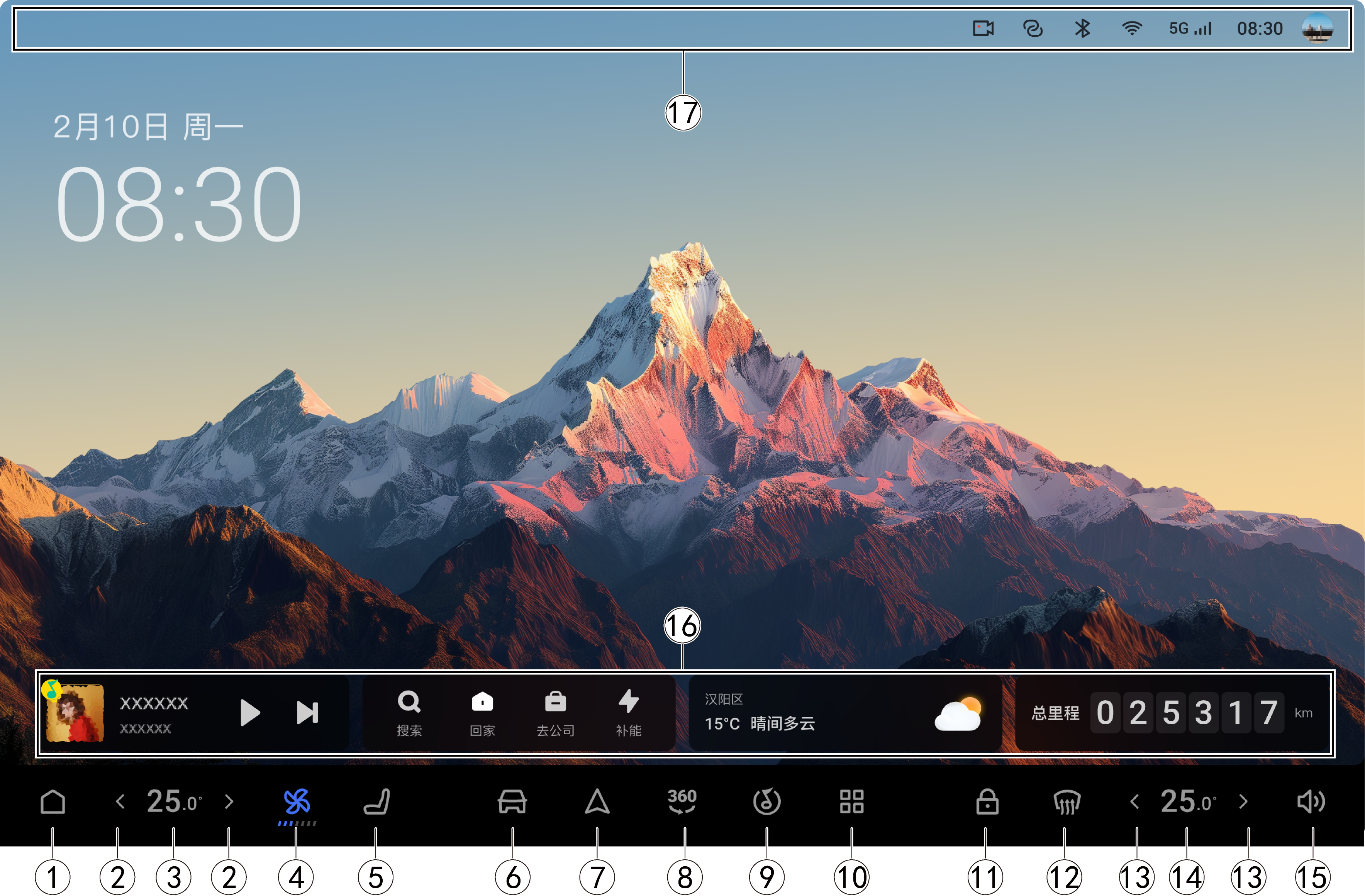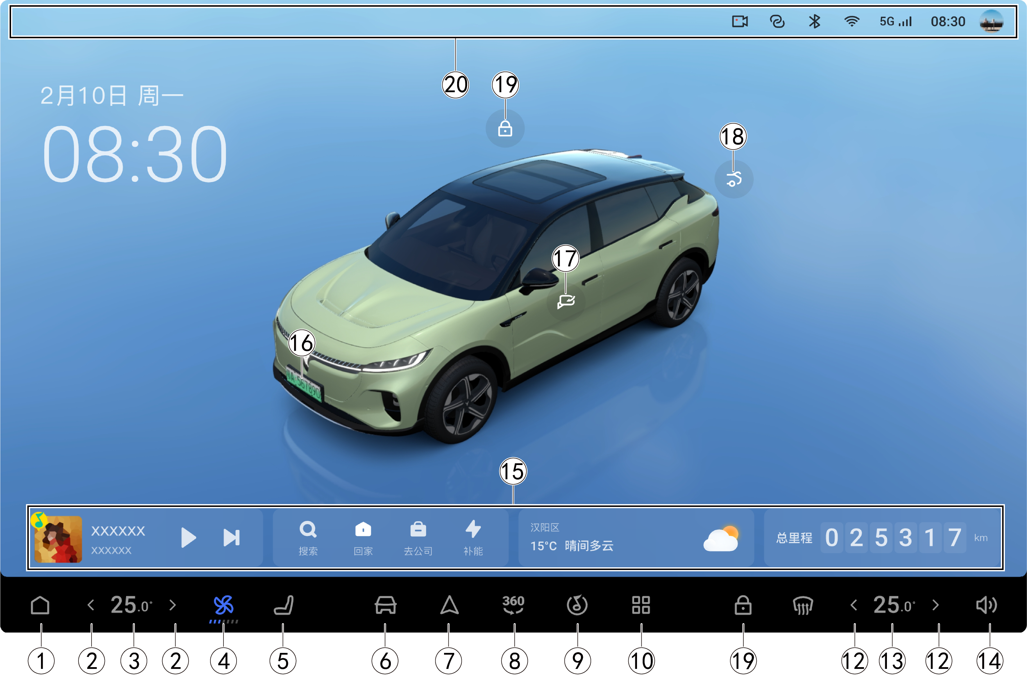 - 展示系统状态信息,部分图标会依据系统状态,呈现不同样式(可点触状态栏图标进行快捷操作,具体功能请以实车为准)